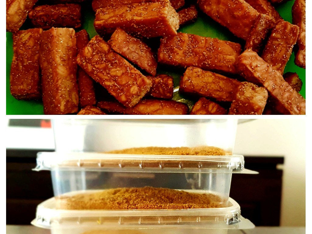 Snijd de tempeh in gelijke rechthoeken met de lengte van 2 vingerkootjes (wijsvinger). Zet een pan op middelhoog vuur en laat warm worden. Voeg een laag zonnebloemolie toe. Bak de tempeh aan alle kanten goudbruin en voeg extra zonnebloemolie toe indien de tempeh de olie volledig opzuigt. Zodra de olie weer uit de tempeh loopt en deze lekker goudbruin geworden zijn, giet dan door een zeef af. Doe de tempeh zonder de olie terug in de pan en voeg een eetlepel coriander, komijn en laos toe. Schud de pan goed om zodat de kruiden goed verdeeld worden. Bak nog een minuutje op laag vuur door. Als het goed is, komen de geurende aroma’s van de kruiden vrij. Strooi wat snufjes zout over de tempeh. Laat de kousenband uitlekken in een vergiet, dep goed droog met keukenpapier en doe dit bij de tempeh samen met de roze garnaaltjes. Laat dit nog even samen warm worden in de pan. Dien direct op.