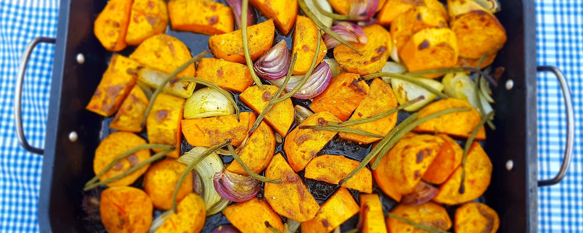 Haal de schaal uit de oven en voeg nu de cherrytomaatjes, de aspergetopjes en stukken zoete aardappel toe. Roer alles nog één keer goed om. Zet de oven op grillstand en plaats de ovenschaal zonder aluminiumfolie nog ca. 5 minuten terug in de oven. Haal de schaal weer uit de oven zodra de groenten bruin beginnen te kleuren. Zo krijg je de lekkere grillsmaak.