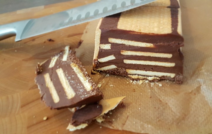 Bedek de vorm met het bakpapier en zorg dat het bakpapier boven de randen uit steekt. Leg vervolgens kaakjes op de onderkant en zijkanten van de bakvorm. Schenk een deel van de cacao massa (vingerdikte) over de laag kaakjes. Bedek vervolgens weer met een laag kaakjes en ga zo door totdat de massa op is en de bovenkant bedekt is met kaakjes. Laat minimaal 6 uur in de koelkast staan om op te stijven. Als het hard genoeg is, haal dan de koek uit de vorm door het bakpapier aan de zijkanten vast te pakken en op te tillen. Snijd vervolgens in gelijke plakken. Heerlijk bij een goede kop (eigengemaakte) cappuccino.